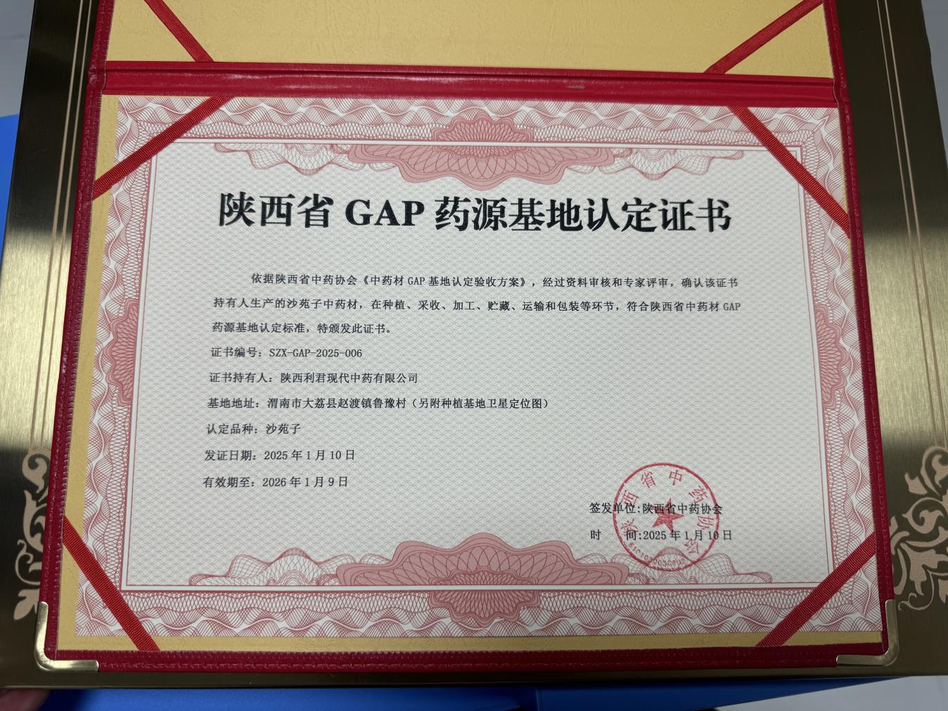 附件1、沙苑子GAP藥源基地證書