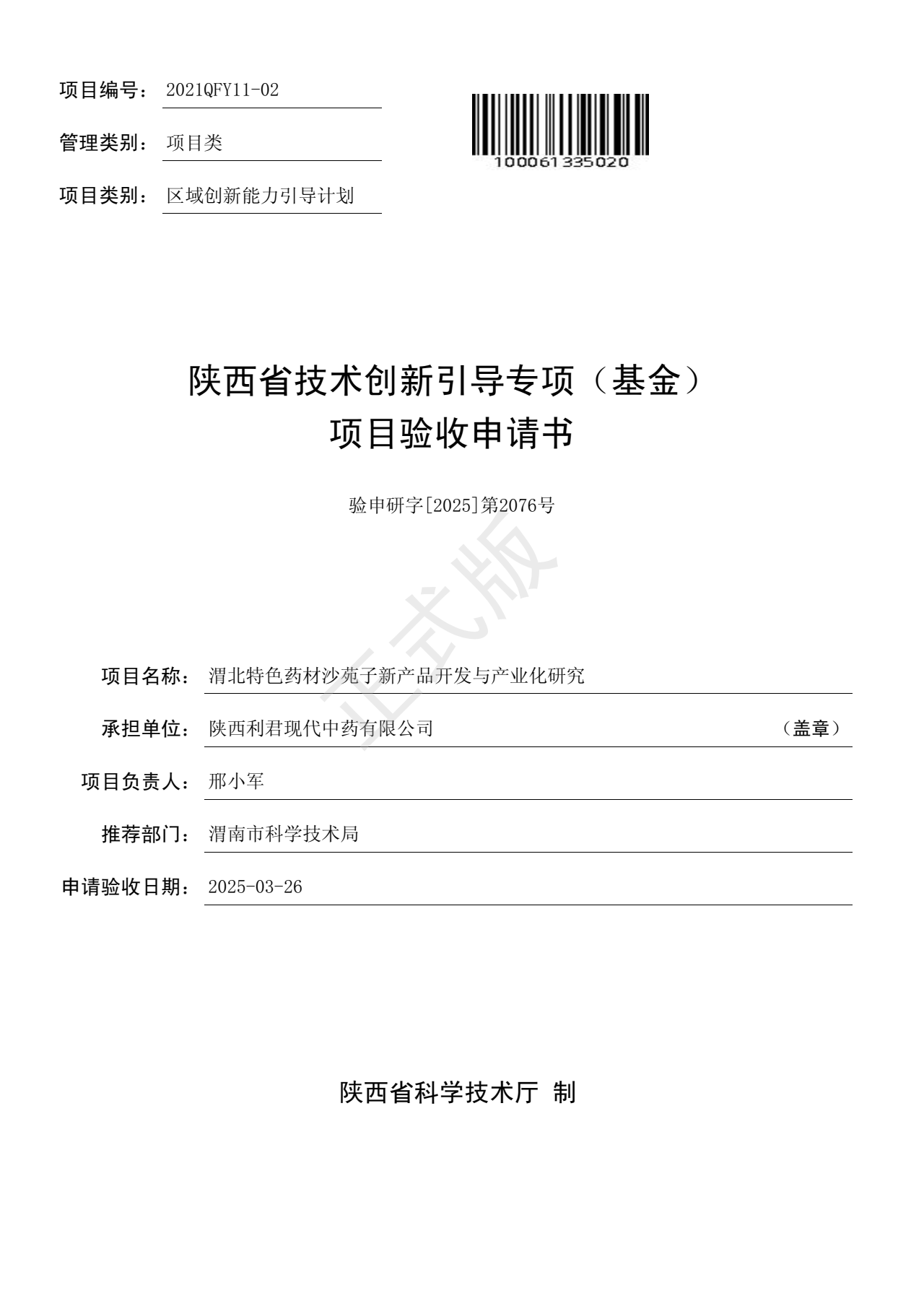 具體計劃、基金的名稱和編號: 陜西省科技廳區(qū)域創(chuàng)新能力引導(dǎo)計劃—渭北特色藥材沙苑子新產(chǎn)品開發(fā)與產(chǎn)業(yè)化研究—2021QFY11-02 |